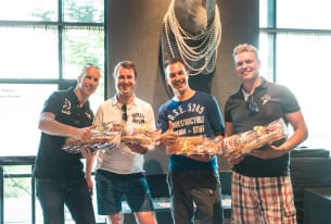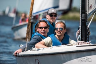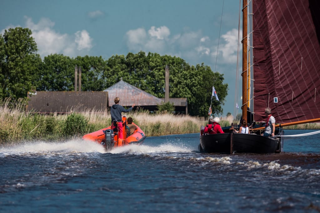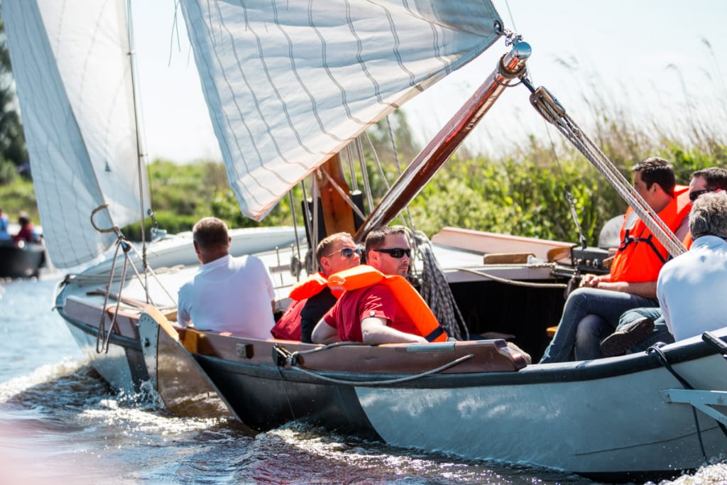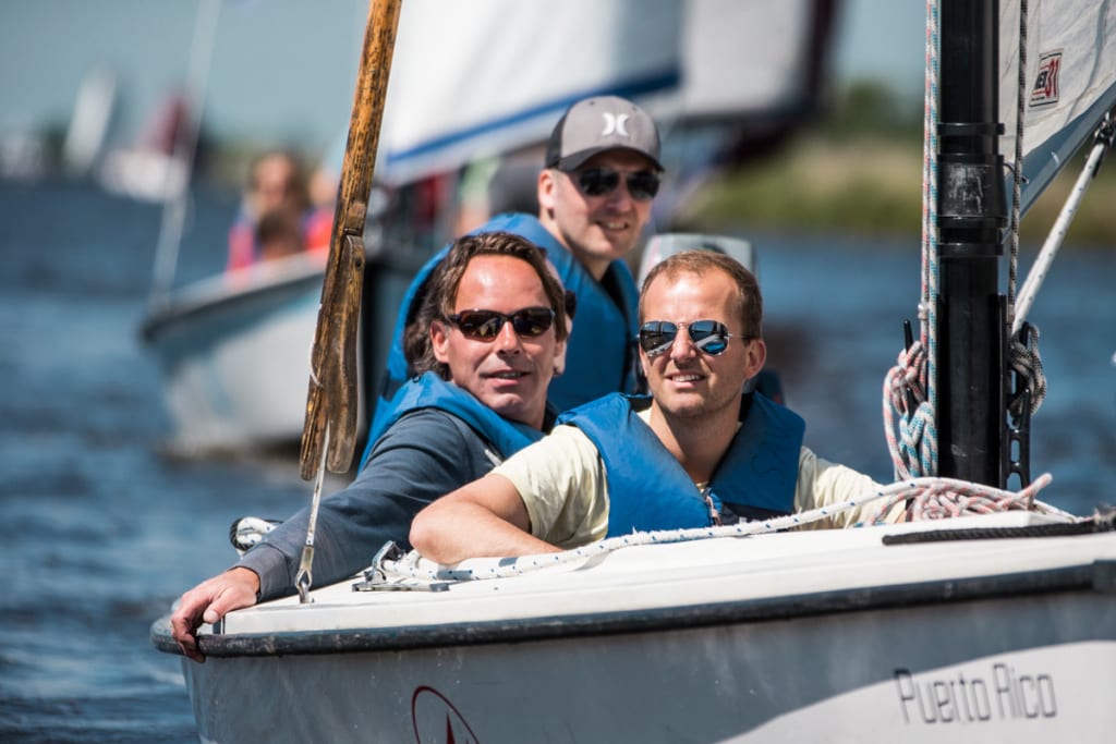 Na de lunch werden de zeilen gehezen voor een zeilwedstrijd op de Langweerderwielen. Beide type schepen voeren een eigen wedstrijd. Om alles in goede banen te leiden werd de vloot begeleid door twee RIB’s met ervaren zeilers van ons team. Na de wedstrijden werd de zeiltocht voortgezet richting Sneek. De gasten meerden aan bij het Hotel waar ze werden ontvangen met Weduwe Joustra Beerenburg en lekkere bitterballen. Ondertussen bracht ons team de zeilboten terug.